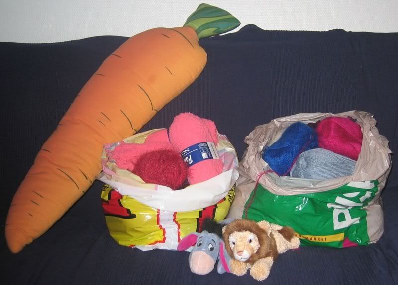 Kuvassa on lankavarastoni sohvallamme tänä iltana porkkanan, Ihaan ja jellonan kanssa.